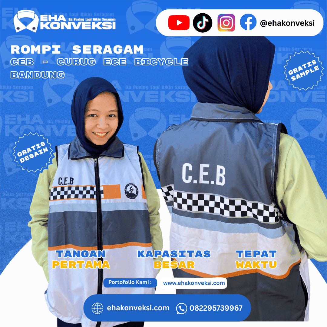 Eha Konveksi adalah Konveksi Rompi Bandung berpengalaman lebih dari 13 tahun. Kami melayani pembuatan rompi custom seperti ……, hingga rompi seragam perusahaan. Dengan tenaga profesional dan fasilitas lengkap, kami siap memenuhi kebutuhan rompi instansi, komunitas, maupun sekolah dengan kualitas terbaik dan custom sesuai kebutuhan anda